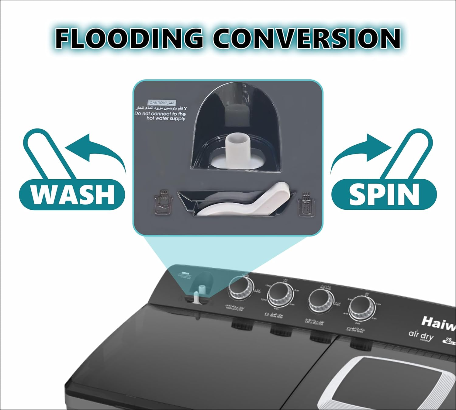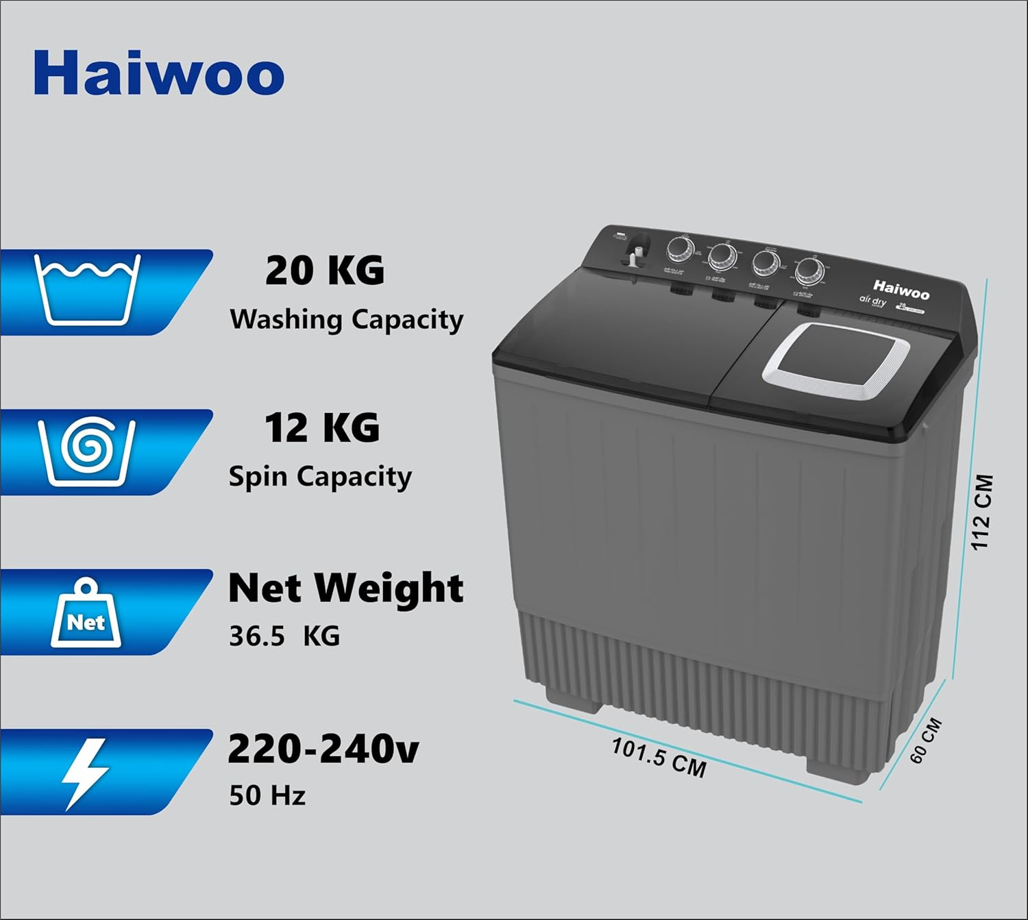 Description for Haiwoo 20kg Twin Tub Semi Automatic Washing Machine, 12kg Spin, Mechanical Wash Timer, Intuitive Control, Durable Aluminum Spin Motor, 220-240v Voltage, 50 Hz, Gray | HWM2050X