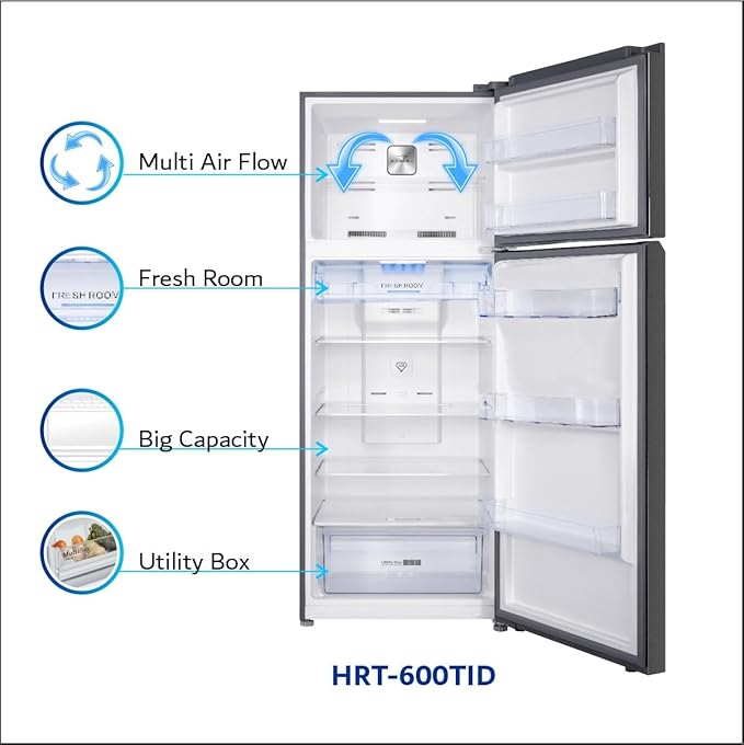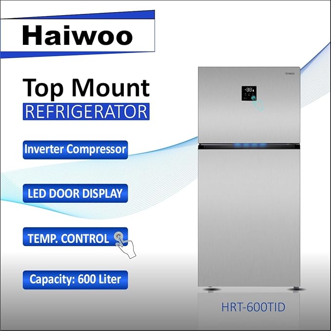 Haiwoo HRT-600TID Refrigerator 600 Liters Double Door Top Mount, Inverter Compressor No Frost Fridge & Freezer Multi Air Flow with LED Display and, Interior LED Light TEMP. Control & HRT600TID INOX COLOR