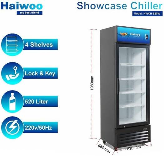 Haiwoo HWCH-520W Showcase Chiller, Single Tempered Glass Door, 423L Cooling Capacity, Refrigerant R134a, Self-Evaporate Water Disposal Pan, No-Frost Technology, Black | B0C99NTZP8