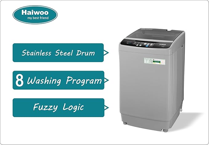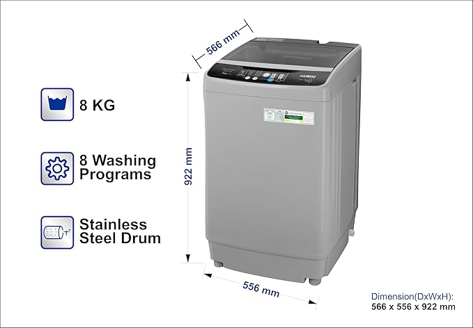 HAIWOO HWFTL-80L1258 8Kg Top Load Free Standing Washing Machine Fully Automatic, 8-Multi Programs, Hot & Cold Water Inlet, Stainless Steel Drum, Voltage AC 220-240V Model: HWTL-80L1258,1 Year Warranty